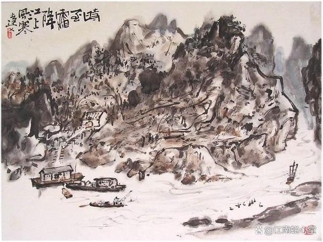 记得那年冬日,曾因些须俗务离渝乘船去木洞。三二小时途程,余亦懒得混杂在气息浑浊的大舱内了,遂干脆携瓶小酒,独自坐在火轮顶篷一旮旯稍稍背风处,仰观昊天冻云翻卷,俯瞰大江寒流喧哗,亦饮亦咏亦啸,可谓颇得其乐。此《时至霜降 江上风寒》一画,便为彼时微醺之中印象,其后援笔补志。画虽逸笔草草,却得山川大势与巴渝冬江萧瑟而不失苍茫之独特情韵,尤其以形貌生动多变而尽显“真山水”面目。诸多细节点缀,当证兹言不虚。画既呈此,观者可自品玩。